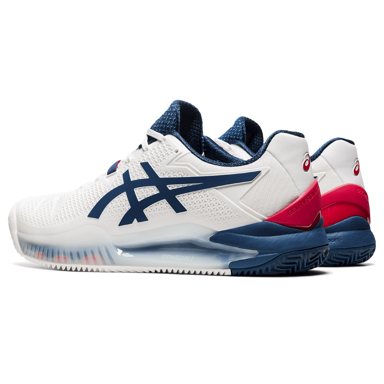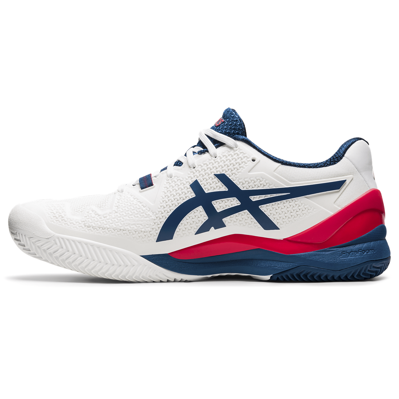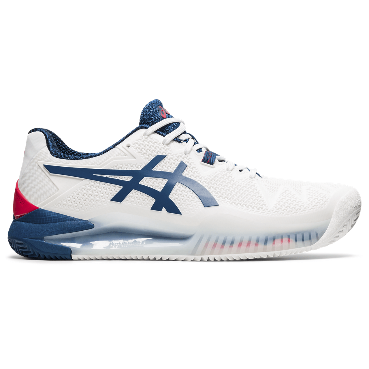 The GEL-RESOLUTION™ 8 CLAY tennis shoe promotes a responsive stride with a close-to-the-court feel. The FLEXION FIT™ upper provides form-fitting support with the integration of DYNAWALL™ technology, which offers added midfoot stability during lateral movements and coast-to-coast coverage.