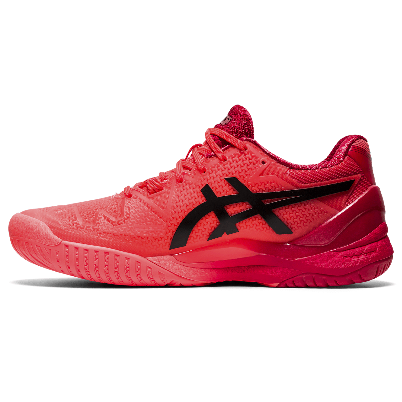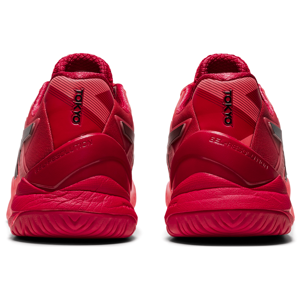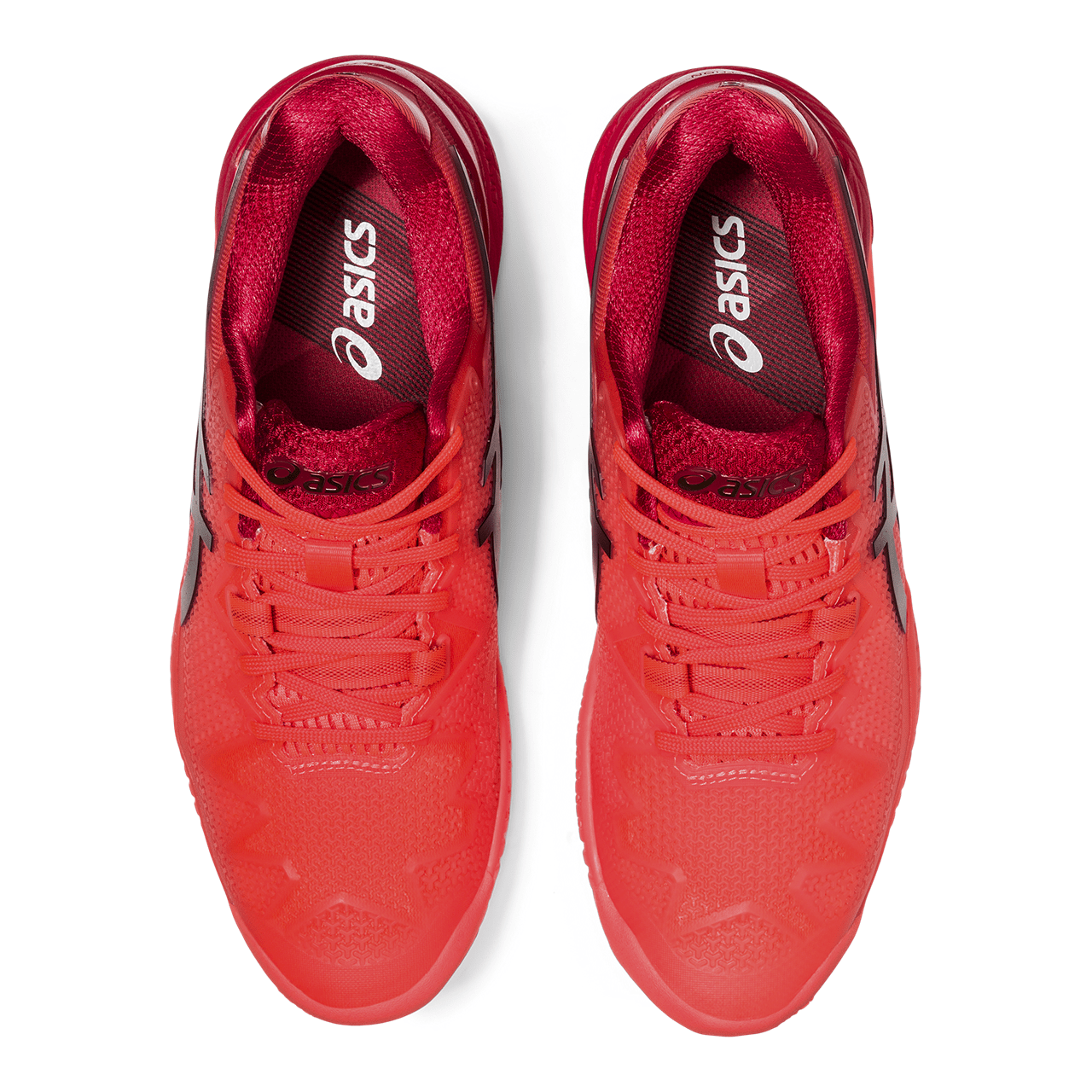 Representative of the color red and its symbolism of the sun in Japan, the spike features an exclusive colorway that’s inspired by an athlete’s burning passion to compete, the GEL-RESOLUTION 8 Tokyo tennis shoe promotes a responsive stride with a close-to-the-court feel. The FLEXION FIT upper provides form-fitting support with the integration of DYNAWALL technology, which offers added midfoot stability during lateral movements and coast-to-coast coverage. Implementing a torque control feature in the heel counter, this shoe is also designed to help maintain a locked in feel during quick transitions.